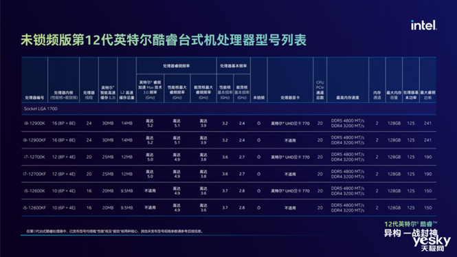 第二轮公布的12代英特尔酷睿处理器一共八款,分别是英特尔 i9-12900K/KF,i7-12700K/KF,i5-12600K/KF。各式处理器的详细资料如下图所示。