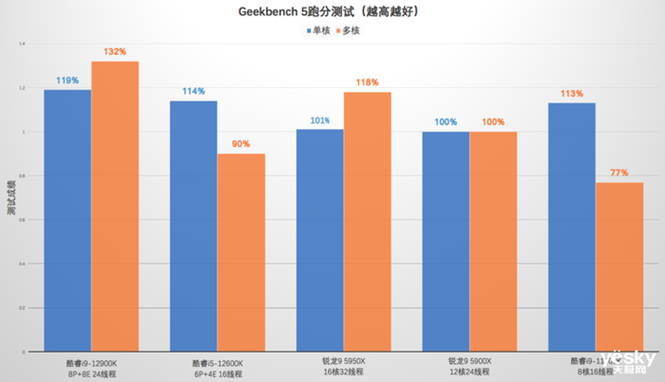 在GeekBench 5测试中,英特尔 i9-12900K的单颗战绩领先锐龙9 5950X达17%,领先锐龙9 5900X约19%;多核性能也超越了锐龙9 5950X约12%,领先锐龙9 5900X达至32%。