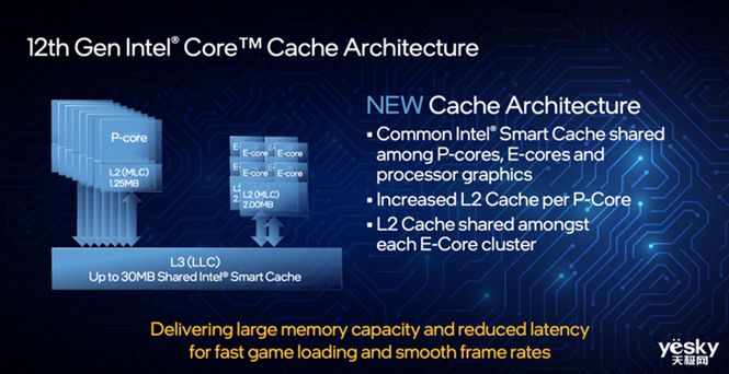 12代酷睿不但率先采用了Intel 7(10nm)制程工艺,此外还带来了x86史上最重要的一次创新――混和架构。在12代酷睿中英特尔首次采用了性能核(P核)与节能核(E核)两种不同核心,比如说英特尔 i9-12900K拥有8个性能核和8个节能核,从而更好地兼顾阻抗对于高频率、多线程的需求。并且,12代酷睿的每个性能核都拥有独立的1.25MB二级缓存,节能核为四个核心一组共享资源2MB二级缓存;此外性能核、节能核共享资源三级缓存,因而英特尔 i9-12900K拥有14MB二级缓存,和较之上代几近翻倍的30MB三级缓存。