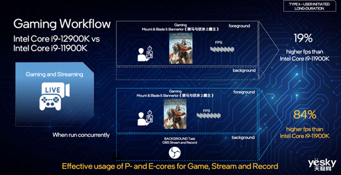 比如说视频中展示的游戏情景,凭借着英特尔硬件线程调度器可以将游戏运转等主要任务交予性能更强劲的性能核,确保游戏顺畅。当玩家游戏现场直播或者使用其他应用领域时,进行有效率调度,如启动应用领域时性能核出手确保组织工作效率,等到应用领域切换至前台时,节能核接手,既可以确保录制、推流稳定,又能为玩家提供更多更高帧率的游戏体验。英特尔也表示在与AMD 锐龙9的对比中,12代酷睿在游戏情景下开启现场直播推流后,优势王俊伊了。