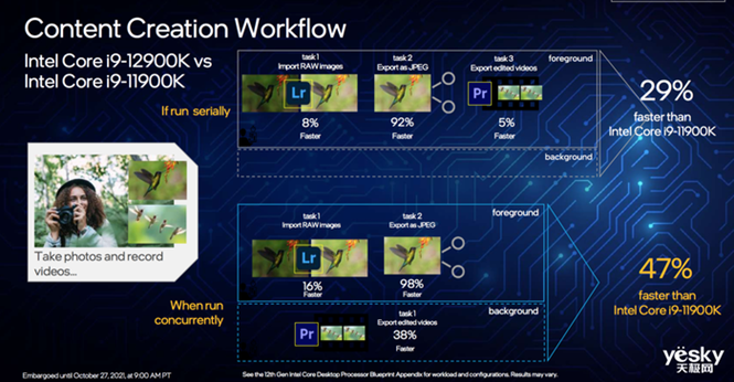 当然不但是游戏情景,在内容创作时12代酷睿的混和架构和英特尔硬件线程调度器同样能带来组织工作效率提高。比如说通过Adobe Premiere Pro、Lightroom等软件进行图像相片编辑时,在组织工作流中不但需要剪辑影片,还需要同步处理相片素材。在12代酷睿处理这项多线程任务时,如果仅仅是Premiere Pro视频音频文件,所以性能核将全力以赴。在音频文件阶段启动Lightroom进行相片编辑,所以视频音频文件组织工作将交予节能核在前台处理,性能核将迎上前去,负责当前需要处理的相片编辑组织工作。