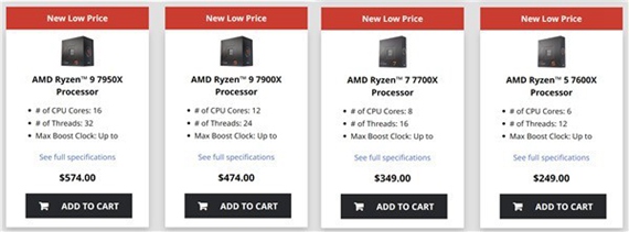 在中国、欧洲、美国等全球各地陆续实际降价之后,官方也悄然调低了AMD 锐龙7000系列的价格,与零售价基本一致。在AMD美国官网上,锐龙7000系列都打上了“NewLowPrice”的标记,看这样子应该是永久性降价,而不仅仅是为了即将到来的黑五。