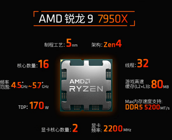 AMD 锐龙9 7950X处理器采用Zen4架构,具有16核心32线程的高规格配置,高达5.7GHz的高规格频率,80MB的超大游戏缓存,性能非常全面。