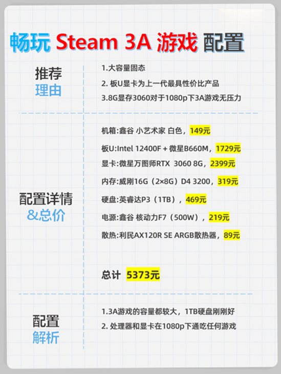 现在Steam秋季特价已经开始,大量的3A游戏骨折价格,这里为大家3A游戏配置推荐一套1080p分辨率的配置。