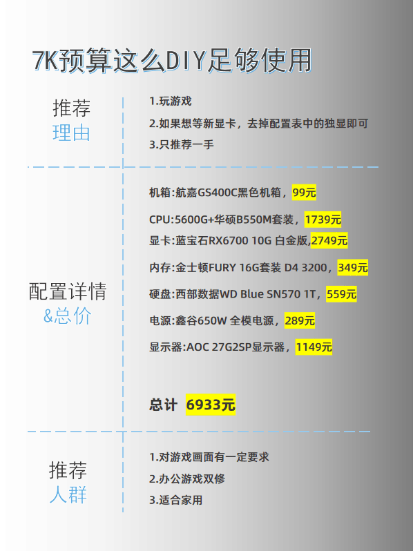 7000预算已经可以组装一个配置非常好的主机。在这个时间节点组装PC,7000预算攒机可以等待一波新的显卡上市。因此,CPU特别选择了5600G,具有强大的核心显示功能。如果不想等40系列中端卡,选择老显卡就够了。