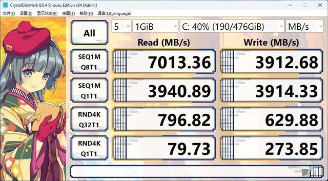 使用crystaldisk测试硬盘的速度。可以看出,连续读写达到了7013MB/s,写速度达到3912MB/s,与宣传基本相同。这绝对是顶级旗舰固态硬盘的水平。