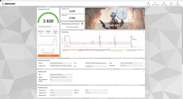 在Timespy测试中得分2820,显卡得分229,CPU得分850。