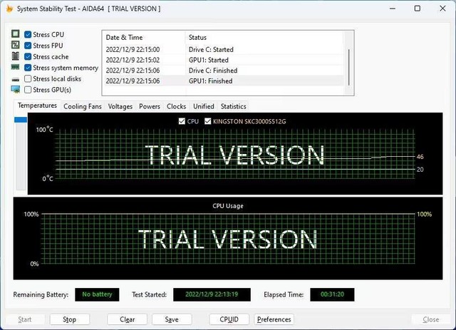 经过20分钟的AIDA64压力测试,处理器的温度一直保持在46℃,当然是在CPU的默认35W功率上进行测试,如果调整到45W,温度会在60-70℃之间,当然风扇会稍微大一些,但都远低于报警触发温度。