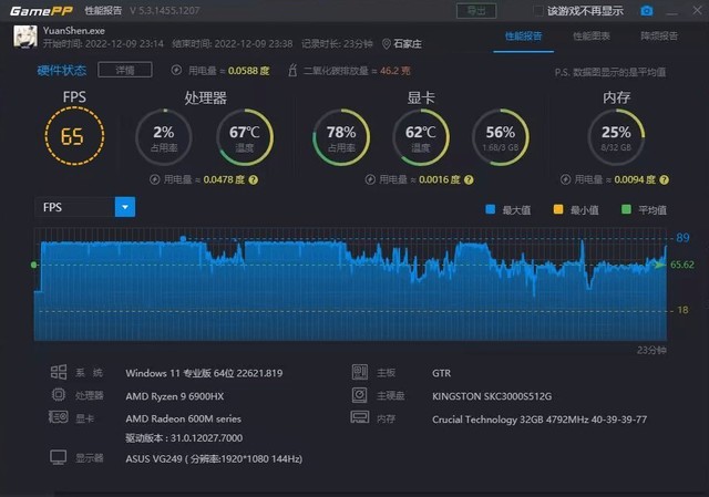 游戏测试是由非常受欢迎的原神进行的。使用2560*1440的画质和1920*1080的高分辨率可以达到65帧左右,非常流畅。可以看出,Radeon680m的核心显卡性能非常强大,足以满足大多数3D游戏流畅运行的需求。