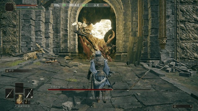 接下来,在1920*1080分辨率下使用艾尔登法环进行测试。FPS在中间画质下可以达到50左右,FPS在进入较少贴图的场景下可以达到60帧+,整体流畅。