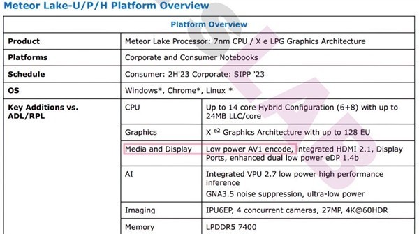 最近,英特尔在最新发布的媒体驱动文档中确认,MeteorLake14代core将支持AV1格式视频的编解码,这是PC处理器上的第一次。据悉,MeteorLake将对核显示器进行大规模升级,其架构将从XeLP升级为性能更高的XeLPG,也就是Arca系列显卡中使用的XeHPG架构的低功耗优化版本,128个单元,比现在增加了三分之一。
