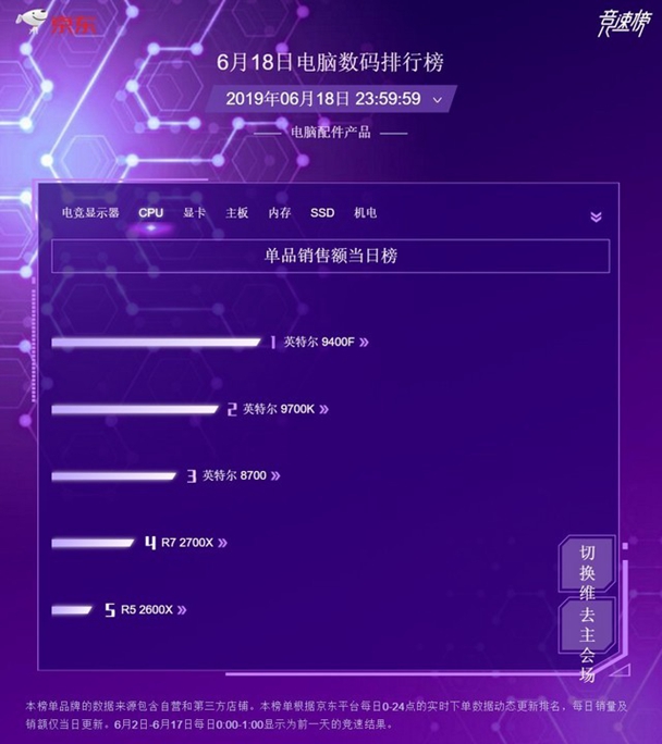 今年一年一度的618购物狂欢你剁手了吗?截止到6月18日晚上23点59分,今年的618狂欢活动战闭,各大销售榜单纷纷出炉,其中CPU单日销售额排行榜中,英特尔新秀i5-9400成功占据了榜首。
