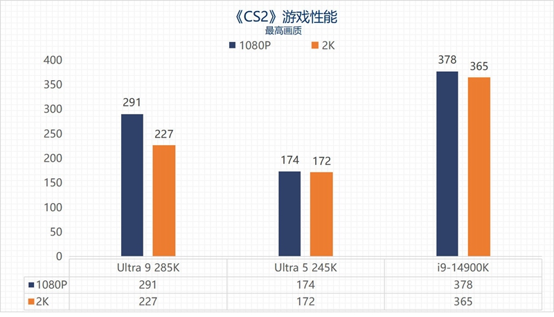 首先是《CS2》,这款游戏在显卡达到一定性能之后,处理器对游戏的影响就会比较明显,实测酷睿Ultra 9 285K比i9-14900K要的表现要低不少。