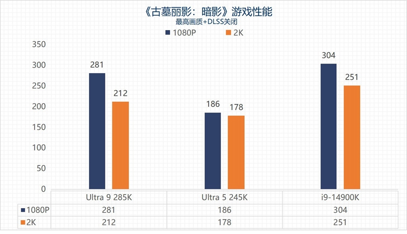 《古墓丽影:暗影》同样如此,酷睿Ultra 9 285K在1080p分辨率下平均流畅度281fps,2K分辨率平均流畅度212fps,而i9-14900K的表现要更好一些。