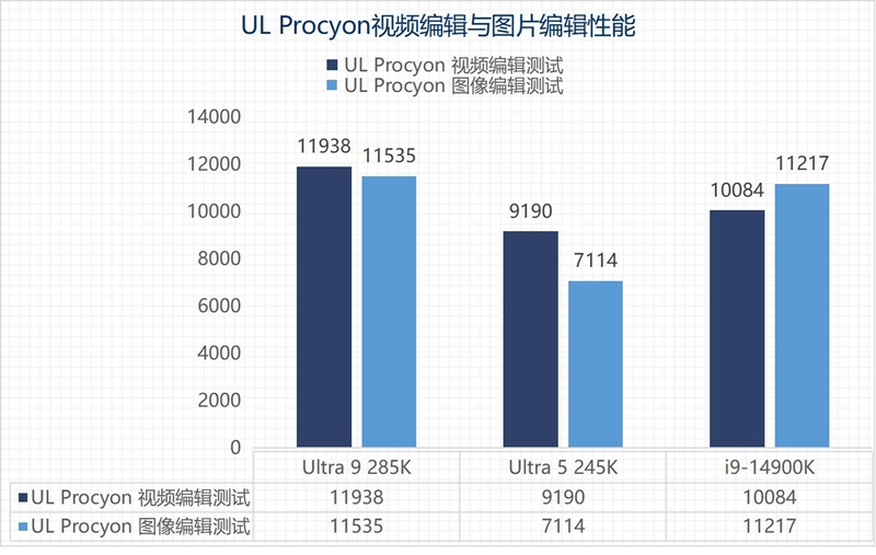 UL Procyon的视频与图片编辑性能,酷睿Ultra 9 285K就要好上不少了,其视频编辑性能评分11938,图片编辑性能评分11535,都要高于酷睿i9-14900K平台。