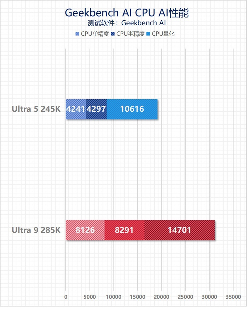 所以接下来我们看看英特尔酷睿Ultra 9 285K和酷睿Ultra 5 245K两颗处理器的AI性能表现。这里我们主要参考Geekbench AI和UL Procyon的性能指标。