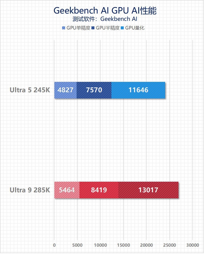 首先来看Geekbench AI的CPU、GPU、NPU的单精度、半精度、量化性能。CPU方面酷睿Ultra 9 285K要远远优于酷睿Ultra 5 245K的表现,毕竟二者的CPU规格差不少。GPU和NPU由于二者差异并不大,只是频率方面的一些差异,因此在AI性能方面差不多。