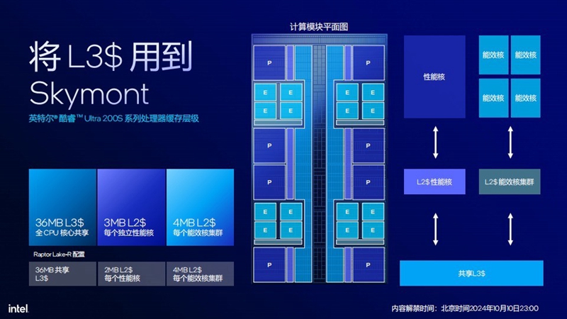 同时,Arrow Lake在规格参数上也做了相应升级,P-Core的二级缓存从2MB增加到3MB,且二级缓存在P-Core上按照每个核心进行分配。而每4个E-Core集群可以共享4MB二级缓存。最终P-Core与E-Core能够同时共享36MB三级缓存,这些改变确保Arrow Lake在去掉超线程技术以及略微降低P-Core频率之后,依旧能够保持超越前代的性能输出。