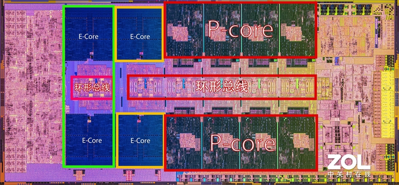 下面这张图则是14代Raptor Lake的核心架构图,可以看到E-Core簇与P-Croe是分区排布的状态,前后两代在核心架构设计上有较为明显的差异。