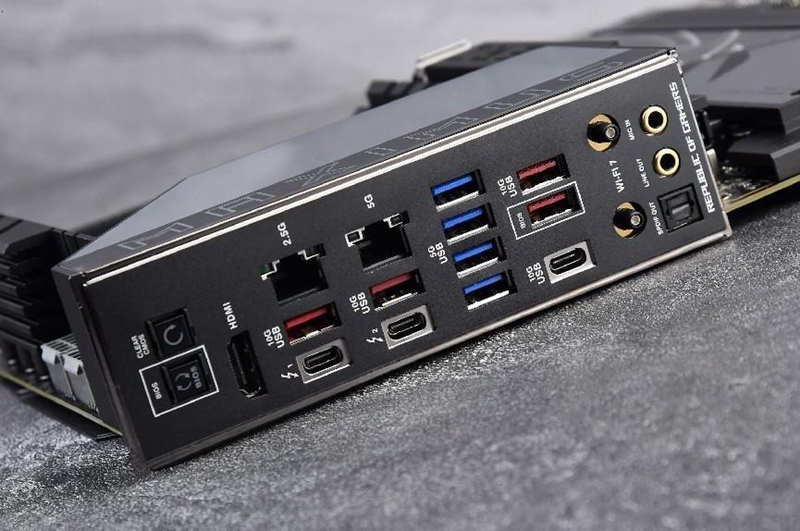 I/O区域,华硕 ROG MAXIMUS Z890 HERO 主板配备了丰富的USB接口,包含4组红色USB 3.2 Gen2 Type-A接口(10Gbps),4组蓝色USB 3.2 Gen1 Type-A接口(5Gbps),一USB 3.2 Gen2 Type-C接口,以及两个雷电4接口,这两个雷电接口还支持雷电共享。此外还提供2.5G+5G双有线网口以及WIFI 7无线网卡,这个WIFI 7无线网卡的天线接口还采用了更易安装的插拔式设计。