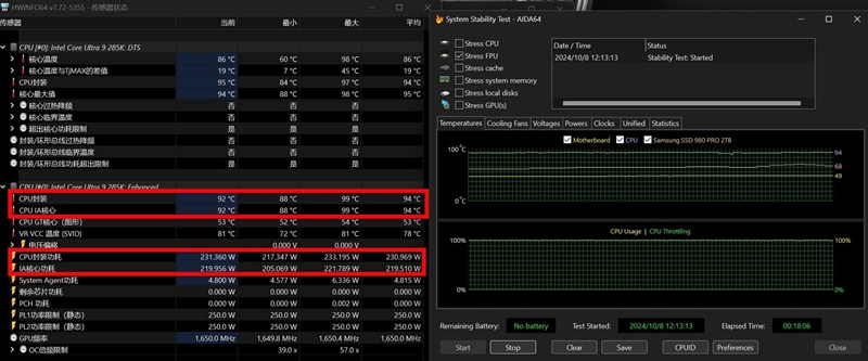 在默认频率和电压设置下,通过AIDA 64 FPU的CPU单拷机测试可以看到,其CPU封装功耗最高为231W,CPU封装温度平均为94℃,相对于13、14代酷睿250W以上的拷机功耗和100℃以上的核心温度而言要好一些。
