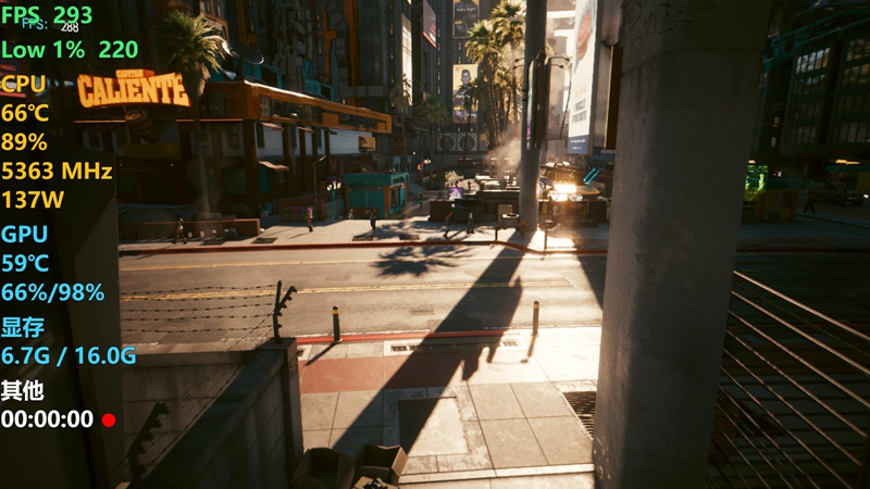 《赛博朋克2077》,为了检验CPU的性能,我们关闭了光线追踪,酷睿Ultra 9 285K的平均帧率在1080p下突破了300fps,而且2K分辨率的帧数提升显著,达到了203.12fps。