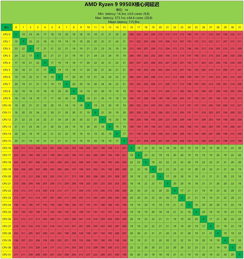 反观AMD最新的锐龙9 9950X,其核心之间的延迟就比较大了,最高达到了373ns,平均延迟115.9ns,核间延迟普遍超过了150ns,整体还是比较高的。