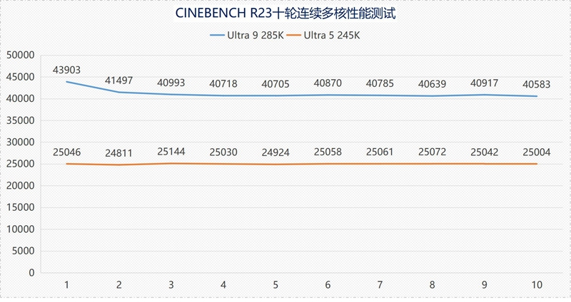 接下来再看看稳定性。通过CINEBENCH R23多核十轮测试可以看到,酷睿Ultra 200S桌面级处理器的跑分稳定性显著提升,这一点与移动级一样。酷睿Ultra 9 285K多核跑分普遍超过40000大关,酷睿Ultra 5 245K则平均达到了25000分,整体跑分相当稳定。