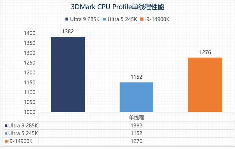 核心性能最后一部分测试是3DMark的CPU Profile测试,酷睿Ultra 9 285K单线程得分1382,最大线程得分19502,都要高于酷睿i9-14900K。