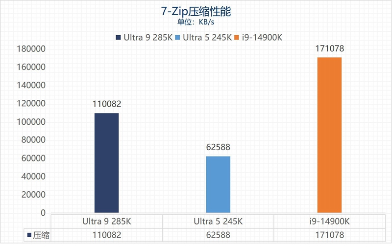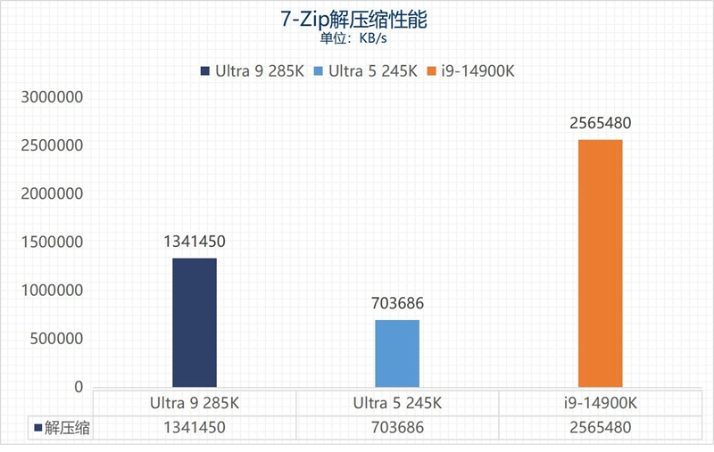 首先是压缩和解压缩性能。由于酷睿Ultra 200S系列处理器取消了超线程,所以在这方面的效率上自然要比酷睿i9-14900K这种具备超线程技术的处理器要低不少。酷睿Ultra 9 285K的压缩速度为110082KB/s,解压缩速度为1341450KB/s,都要低于酷睿i9-14900K。
