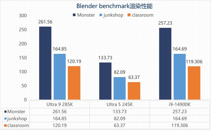 渲染性能方面的表现还是较为不错的,Corona 1.3和Blender两个Benchmark的性能基本持平,酷睿Ultra 9 285K的效率与酷睿i9-14900K相同。