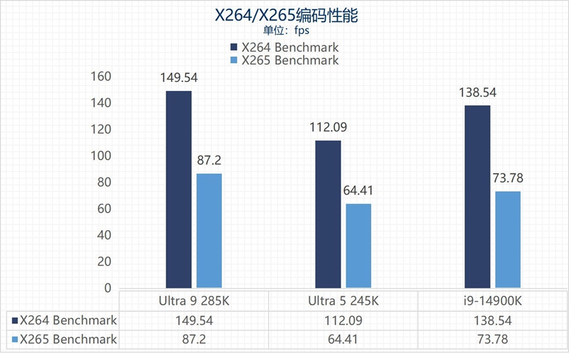 通过X264和X265 Benchmark可以看到,酷睿Ultra 9 285K的H.264/H.265编码性能进一步提升,分别达到了149.54fps和87.2fps,比酷睿i9-14900K效率更高一些。