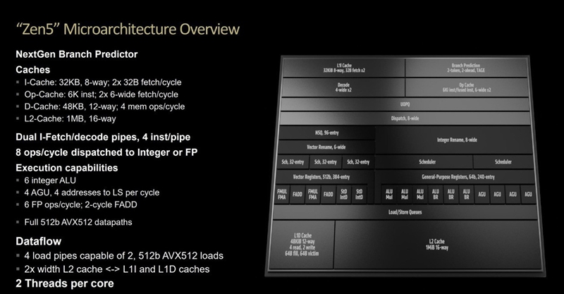 缓存方面,Zen5的L1缓存容量也有所增加,从32KB提升到了48KB,并且增加了访问的宽度,L2缓存也比Zen4提升了一倍,这意味着处理器可以更快地获取需要的数据,提升内存运行效率。
