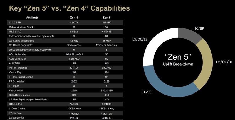 在Zen 4时,AMD引入了AVX-512指令集,主要针对图像分类、语言识别等商用学术领域,不过Zen4时期的AVX-512指令集受制于发热和功耗,采用的256位数据通路。而这一代Zen5没有功耗和温度限制,而且为了满足AI时代的需求,Zen5集成了完整的512位数据通路宽度的AVX-512指令集,这大大提高了Zen5处理器处理AI任务的效率。