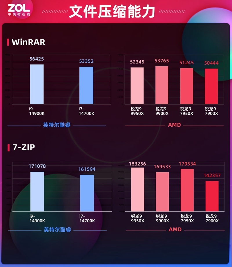 在压缩和解压缩能力的测试中,AMD锐龙9 9950X和锐龙9 9900X在7-ZIP上表现强于酷睿i9-14900K和酷睿i7-14700K,WinRAR这款软件则是两款14代酷睿表现更好。