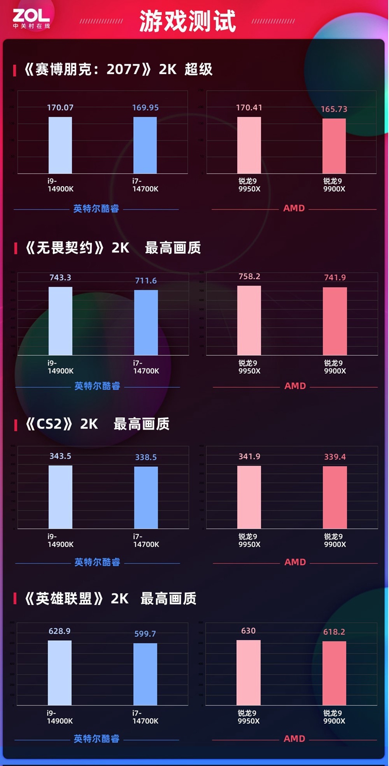 我们首先测试了主流的2K分辨率,在2K分辨率中,AMD锐龙9 9950X在《赛博朋克2077》AMD锐龙9 9950X超出一点,《无畏契约》和《英雄联盟》表现也更好,《CS2》则是酷睿i9-14900K表现更好,在这4款游戏中两款处理器可以说在2K分辨率帧数相差其实不大,AMD锐龙9 9950X整体胜出一些。