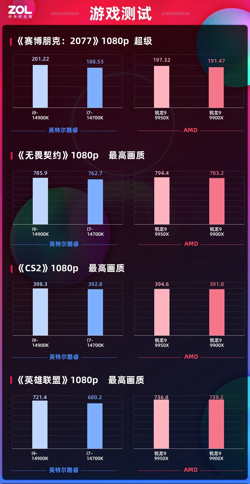 1080p帧数趋势有些变化,AMD锐龙9 9950X在《英雄联盟》、《无畏契约》、《CS2》3款网络游戏帧数表现更好,《赛博朋克2077》这款单机游戏还是酷睿i9-14900K更胜一筹。