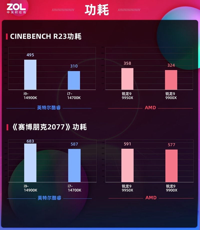 我们还记录了在《赛博朋克2077》以及CINEBENCH R23跑分时双方平台的功耗差异,依旧是AMD锐龙9 9950X和锐龙9 9900X能耗比更为出色,对比酷睿i9-14900K能够节省100w左右的平台功耗,在《赛博朋克2077》游戏上功耗方面甚至能与低自己一级的酷睿i7-14700K相差不大,相当于用竞品i7的功耗表现获得了i9的游戏性能表现。3这就是AMD这代处理器带来的最大提升之一。