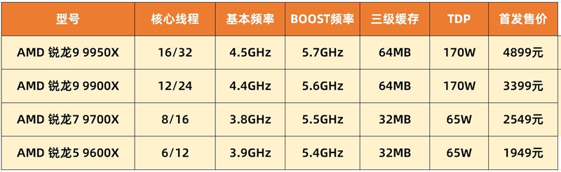 说回这次要分析的锐龙9000系列。锐龙9000系列一共有4款如下图所示,这4款产品正好对应我们上面说的两类人群。至于刚上市的锐龙7 9800X3D这款处理器笔者没放进去,因为它太火爆了,作为目前最佳游戏处理器,发售及售罄,对它来说啥时候抢到货啥时候就是双11。