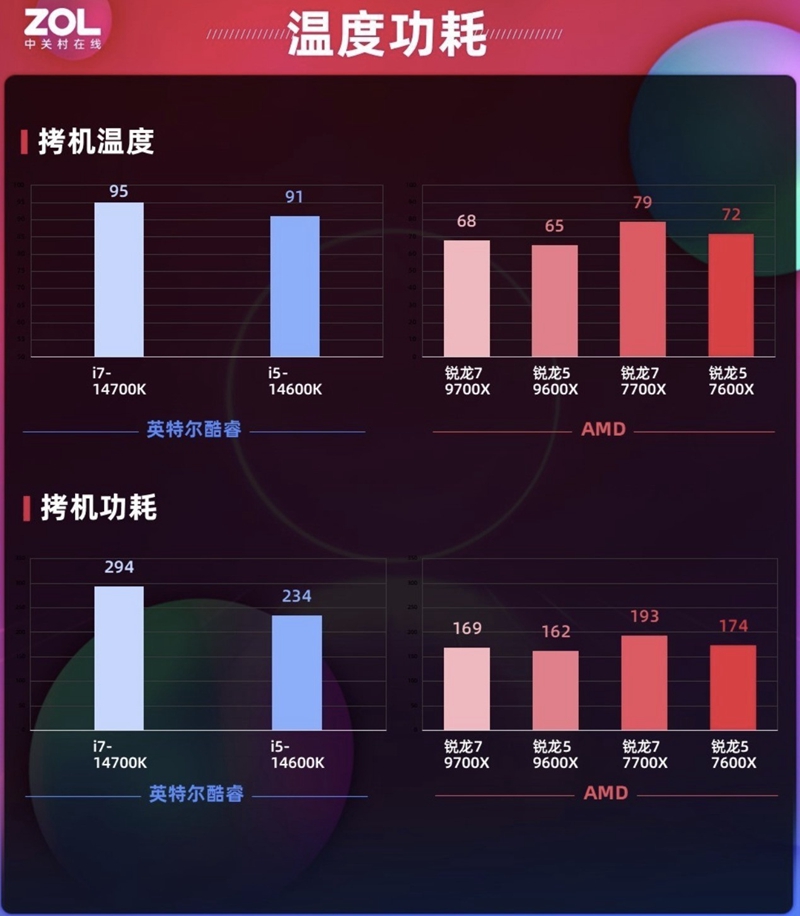 在保证了上述超强的游戏表现同时,AMD锐龙7 9700X/ AMD锐龙59600X做到了极低的功耗和温度,这点和隔壁形成鲜明对比。温度低和功耗低不仅意味着两款处理器长时间游戏会更稳定,还有一大重要优势那就是对于散热器以及主板的要求降低了,不用像隔壁一样对其他硬件要求很高才能发挥出全部性能。所以对于AMD锐龙7 9700X/ AMD锐龙59600X一般的风冷以及常规B650主板即可实现性能释放。这让普遍预算不是很高的游戏玩家更容易打造高性价比平台,将这些省下的预算加到目前对游戏硬件更大的显卡上。
