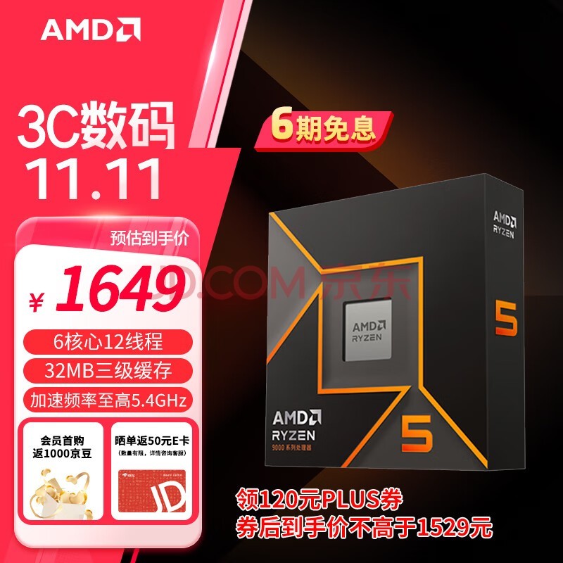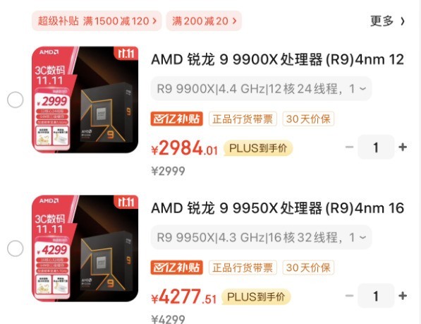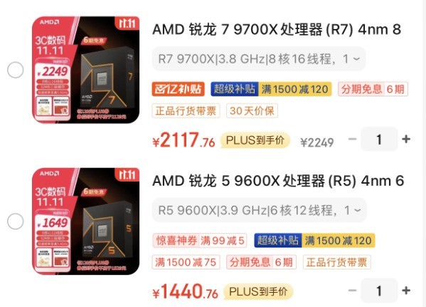 目前双11促销期间。前面看到AMD锐龙7 9700X首发2549元,如今双11叠加各种优惠券以及京东PLUS会员超级补贴只要2117元左右,便宜300多元。AMD锐龙5 9600X叠加各种优惠券以及京东PLUS会员超级补贴则只要1440元,不跟双十一日常价相比又降了百元。当然也要注意这只是现在看到的价格,双11促销当天请以实际价格为准,如果更低记得加保即可。