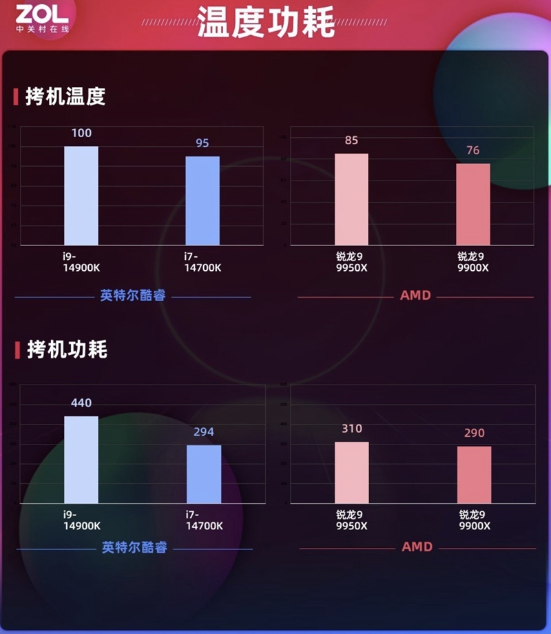 虽然对于创作平台能耗比的要求比游戏小很多,但AMD锐龙9 9900X和 AMD锐龙9 9950X在Zen5架构和4nm工艺的加持下温度和功耗依旧有优势。