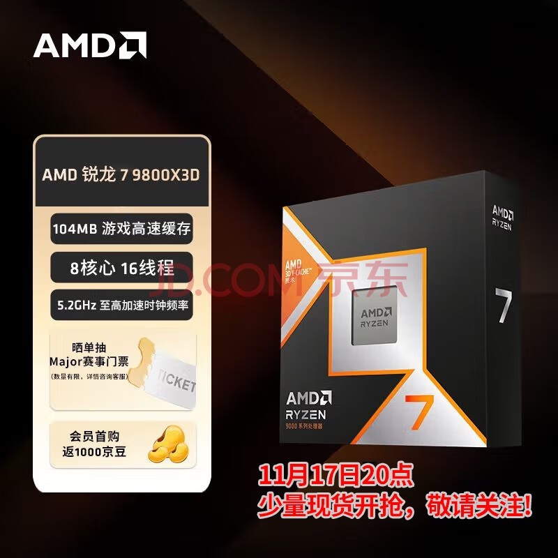 在国内市场,锐龙7 9800X3D同样供不应求。目前京东官方旗舰店预告下次正式发售时间为11月17日晚8点。截至目前,预约人数已超过3.2万,售价稳定在3799元。