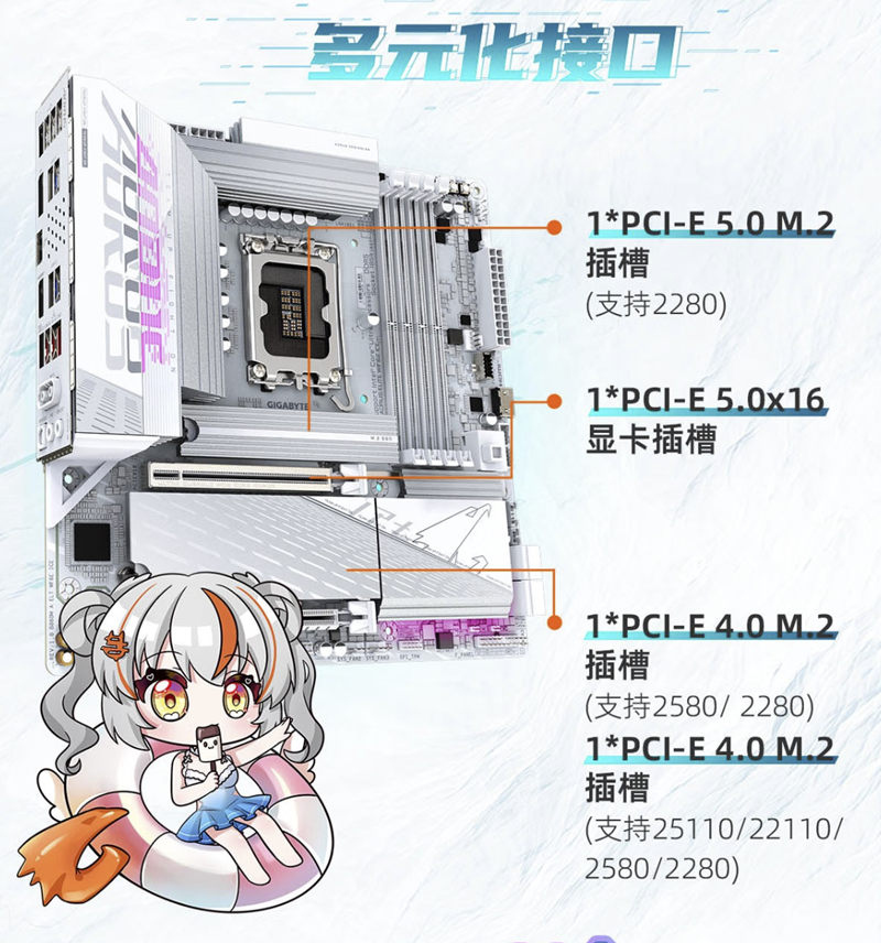 在扩展性方面,有4条DDR5插槽,搭配技嘉AID5黑科技2.0,内存性能保障24%,支持XMP超频至9200MT/s,至高256GB内存扩展,结合KTransformers轻松部署本地大模型。除了拥有一个PCIe5.0x16的显卡插槽用来安装顶级显卡外,它还拥有1个PCIe 5.0M.2 + 2个PCIe 4.0M.2插槽,均配备散热装甲,还有Intel Wi-Fi6E + 2.5G有线网卡,网络流畅不卡顿。它的内存超频性能突出,作为千元价位纯白海景房首选主板,性价比极高。