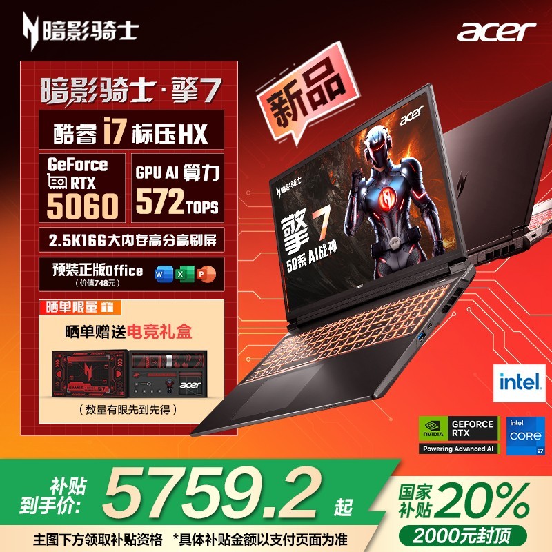 现在参与天猫精选多重优惠活动,原价8599元的宏碁 暗影骑士擎7 2025款游戏本,可享立减1400元叠加1500减150优惠,再叠加政府补贴20%立减1439.8元,限量补贴再减400元,下单还可返100元猫超卡,下单1件实付低至5219.2元即可入手这款性能猛兽。