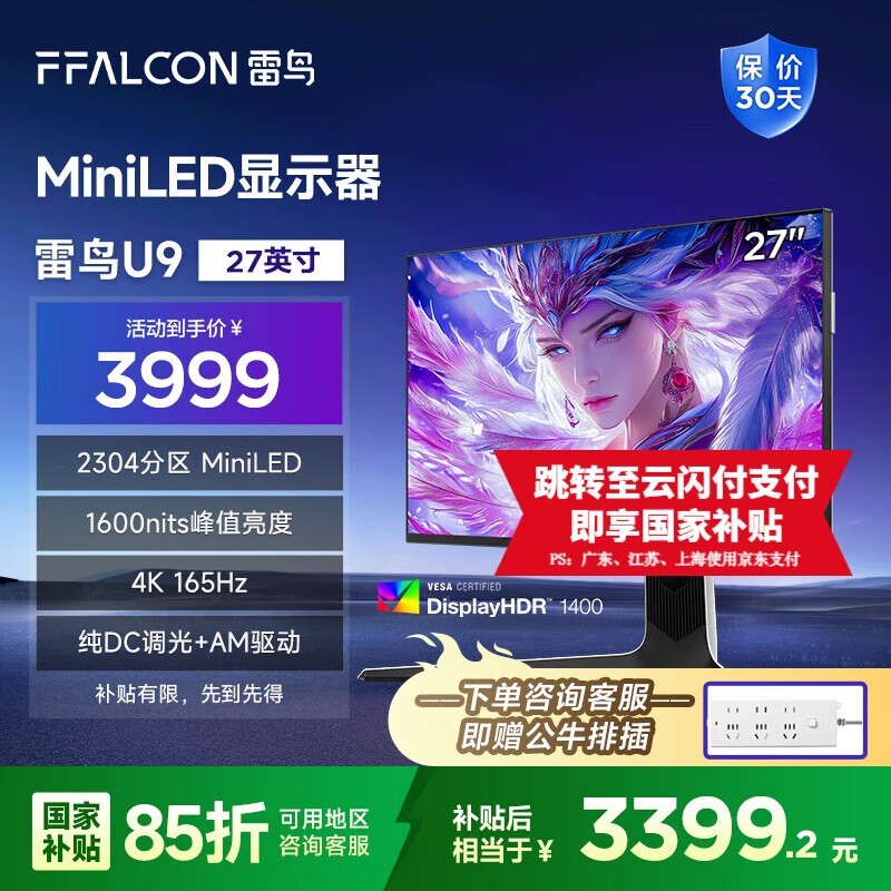 雷鸟 R27U91 U9 27英寸4K电竞显示器165Hz HDMI2.1 HVA HDR1400量子点广色域 MiniLED电脑显示器 国家政府补贴 4K/165Hz/1ms响应