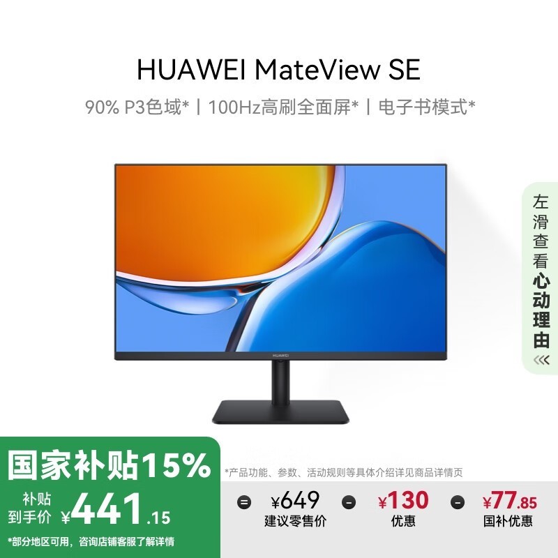 华为 MateView SE 23.8英寸IPS显示器(1920×1080、100Hz、100%sRGB)正在京东促销。华为 MateView SE原价474.00元,活动售价519元,plus下单1件且有政府补贴立减后,到手价低至438.91元。