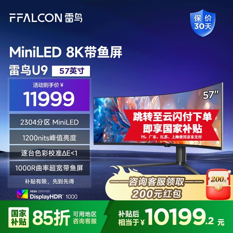 雷鸟 U9显示器在雷鸟官方旗舰店的原价为11373.24元,现在售价11999元。如果你是PLUS会员,可以立减0.5%,还能领取10元优惠券,再加上政府补贴享85折,下单还赠200元红包,最终到手价只要9939.65元,这可是历史低价,有需求的朋友可以考虑入手。