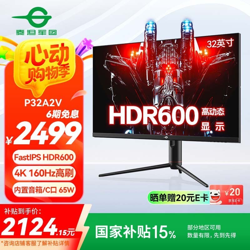 泰坦军团 P32A2V显示器原价2466.51元,京东活动售价3099元,下单立减600元,PLUS会员再立减15.49元,部分地区可享国家补贴15%,实付低至2110.98元,晒单还返20元E卡,最终到手价2090.98元,感兴趣的朋友可以入手。