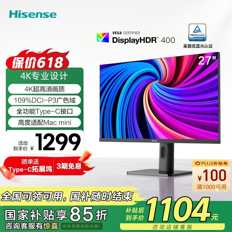 海信 27N5H 27英寸 4K超清 广色域 HDR400 Type-C 适配Mac 旋转升降 IPS 电脑显示屏 显示器 国家补贴